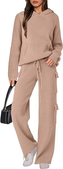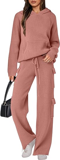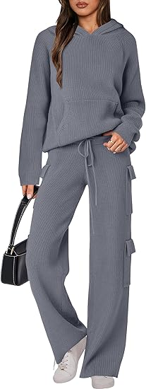 🎄Christmas Clearance 🔥 Women’s Two Piece Outfits Casual Knit Hooded Sweater Straight Leg Pants Set