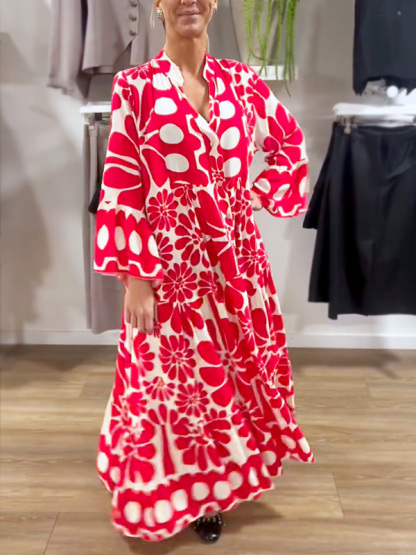 Introducing our V-Neck Button Printed Dress, designed for the modern woman who values sophistication and style. This dress features a stunning print and elegant maxi length, making it perfect for any occasion.